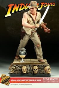 Indiana Jones sollte man erkennen, und zwar nicht nur durch einen Schlapphut und das Tragen einer Peitsche sowie der Lederjacke. Damit dann auch zu einer der größten Herausforderungen, wenn es um Indiana Jones-Merchandise und Produkte geht, bei denen Harris Ford eben nicht abfotografiert, sondern nachgebildet ist. Denn der gute Mann ist sehr schwierig einzufangen als starre Büste oder Statue und wirkt ausgesprochen schnell wie ein schlechtes Abbild, und eben nicht wie Harrison Ford. Wie schaut es mit dieser Statue aus dem Sideshow Collectibles Programm aus? Premium Format, also 1:4-Verhältnis, Mixed Material (Stoffkleidung sowie Accessoires). Hier gibt es Indy in einer Szene aus dem zweiten Film, „Dem Tempel des Todes“ (Temple of Doom).