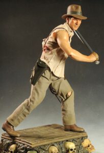 Mit einer spürbaren Dynamik wirkt die Figur von der ersten Betrachtung keinesfalls langweilig oder starr. Inmitten eines komplexen Bewegungsablaufes sehen wir ihn mit blutverschmierten Hemd und einer großen Machete. Es ist gen Ende des Films, als er Mola Ram ans Leder will und grad aus dem Temple entflohen ist und die Sankara Steine in der Tasche auf dem Rücken bei sich trägt. Ein ikonischer Moment, der hier eine tolle Abbildung widerfährt. Hochwertiges Resin, passende und überzeugend ausgestaltete Textilkleidung und eine professionelle Handbemalung – das sind im Grunde die Zutaten hier.