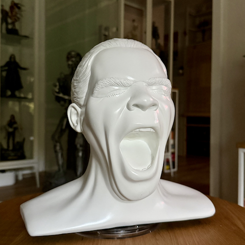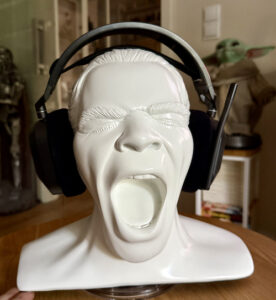 Der Kopf hört am oberen Teil der Schulter auf, oder besser beginnt nach oben hin mit seinem klassischen Verlauf. Ich empfand die Größe als angenehm und passend. Apropos passen passend, meine Kopfhörer von AKG sowie Corsair finde einen guten Sitz auf dem Kopf. Als Hutablage eignet sich diese Dekoration nicht, da der Schädel schlichtweg zu klein ist. Selbst für eine Cap, vor allem, aber für die gängigen One size Modelle.